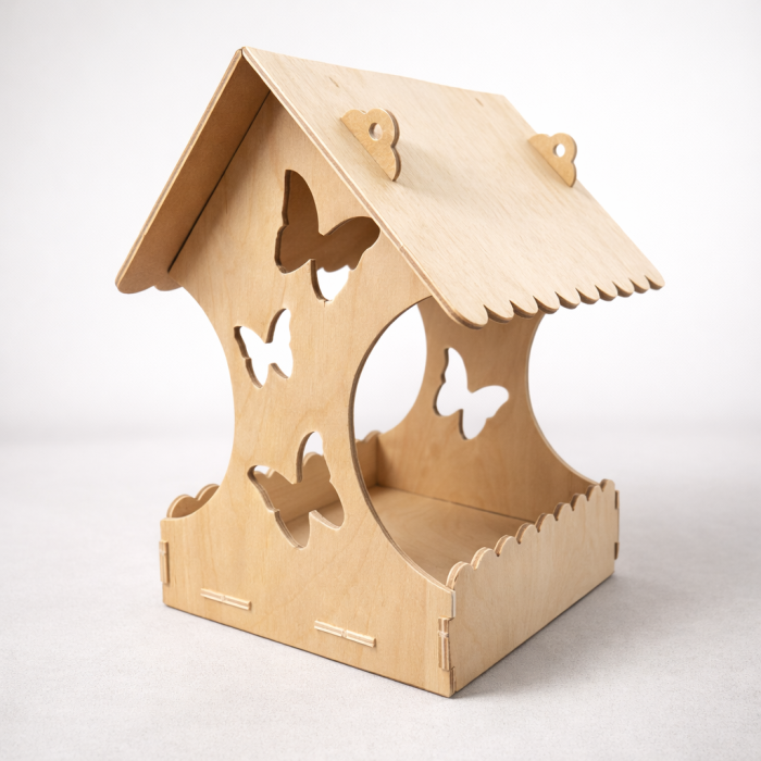 Căsuță/ Hrănitoare pentru păsări, realizată din lemn, cu design decorativ și decupaje în formă de fluturi. Forma deschisă permite păsărilor să ajungă ușor la hrană, iar acoperișul oferă protecție împotriva ploii ușoare.