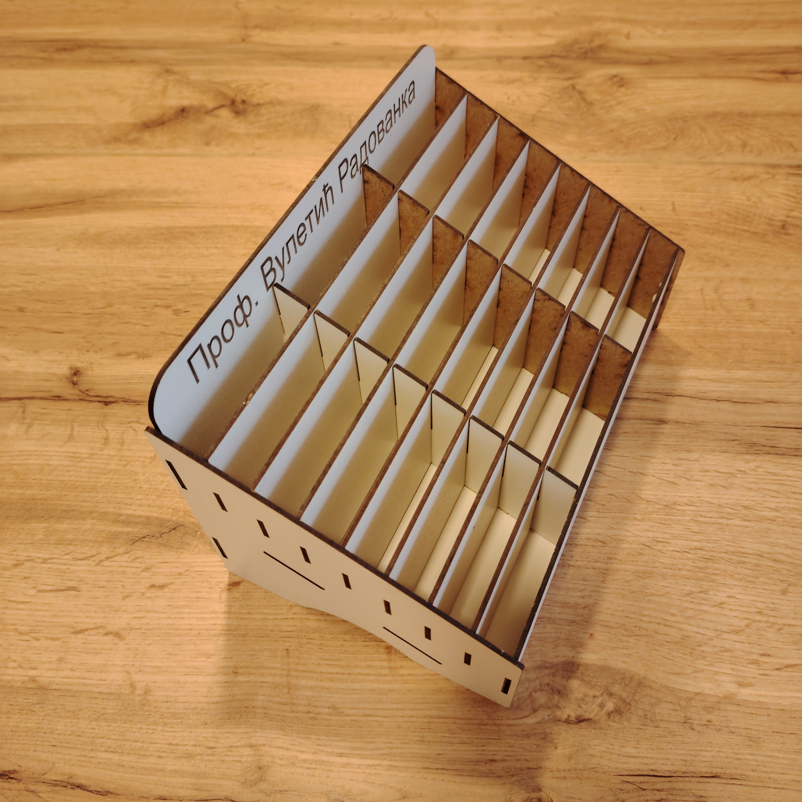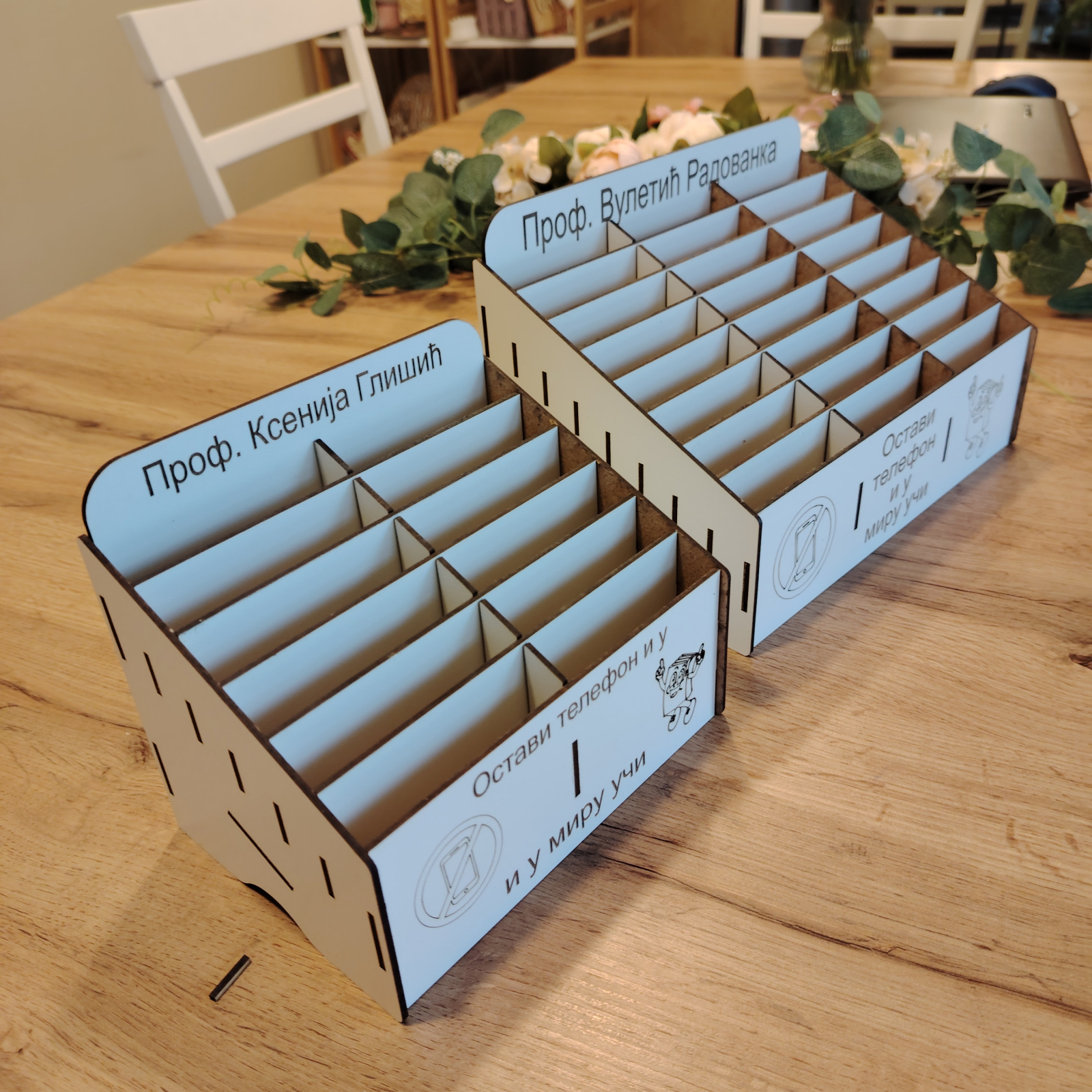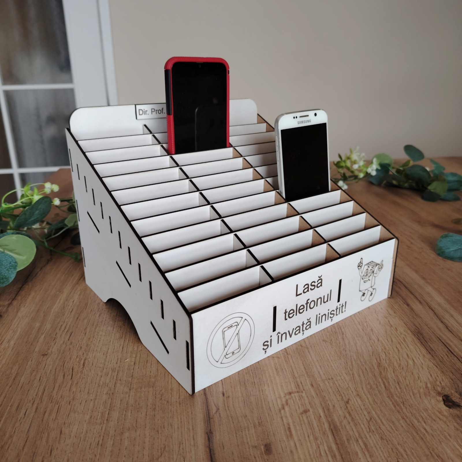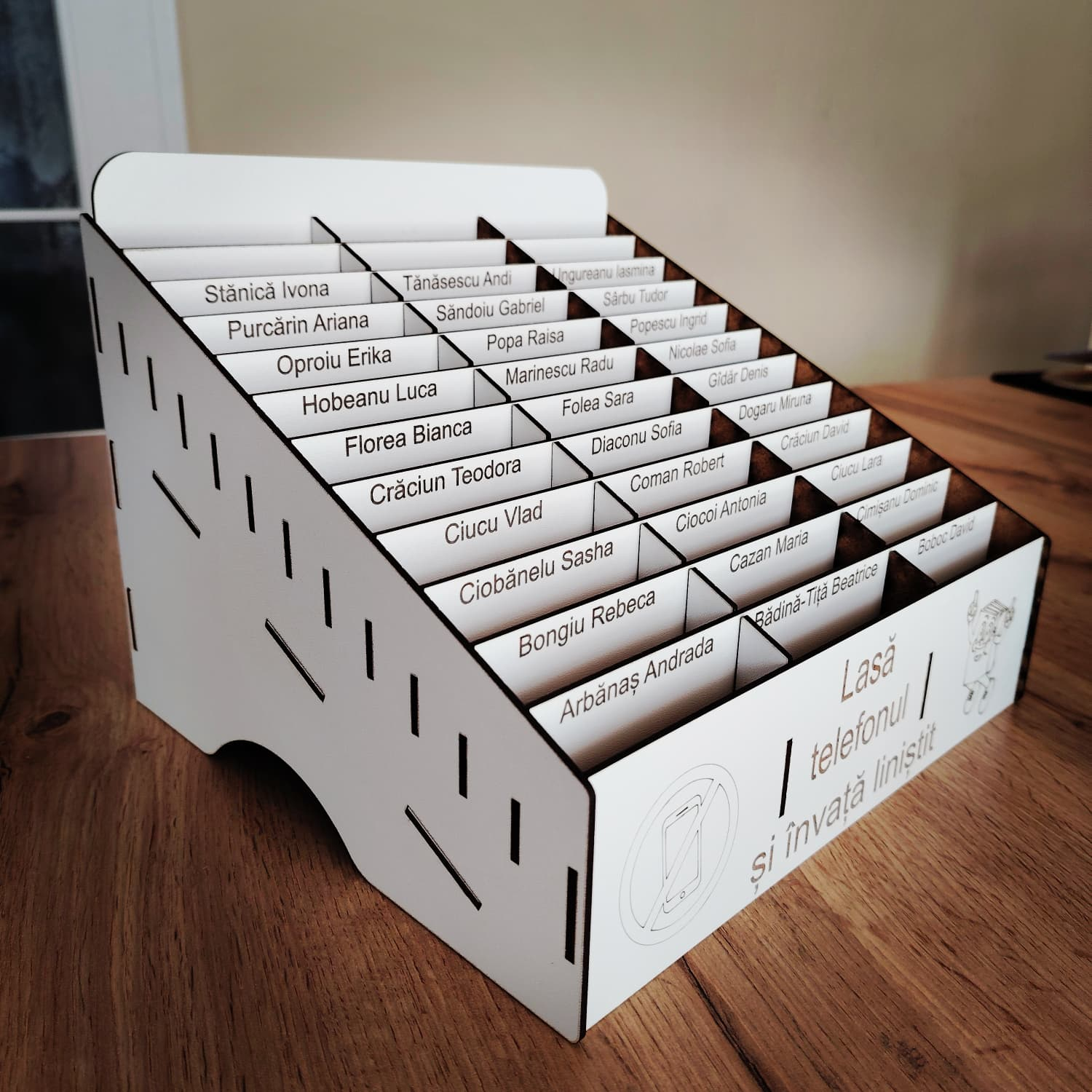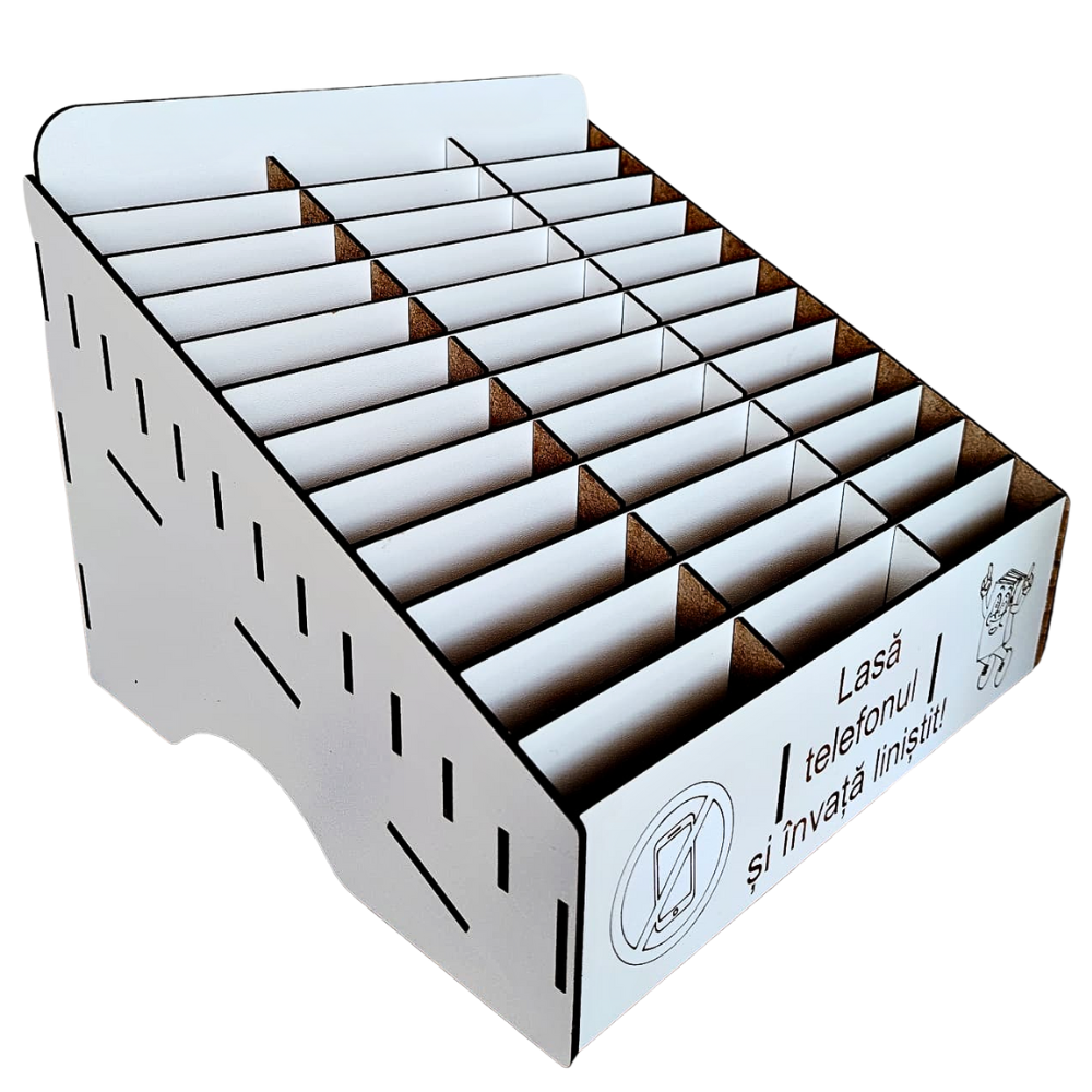 „Phone Jail” este ideală pentru sălile de clasă, biblioteci sau chiar săli de conferințe, asigurându-se că participanții se focusează pe activitățile esențiale. Materialul folosit este placaj din MDF alb, tăiat și gravat laser.
