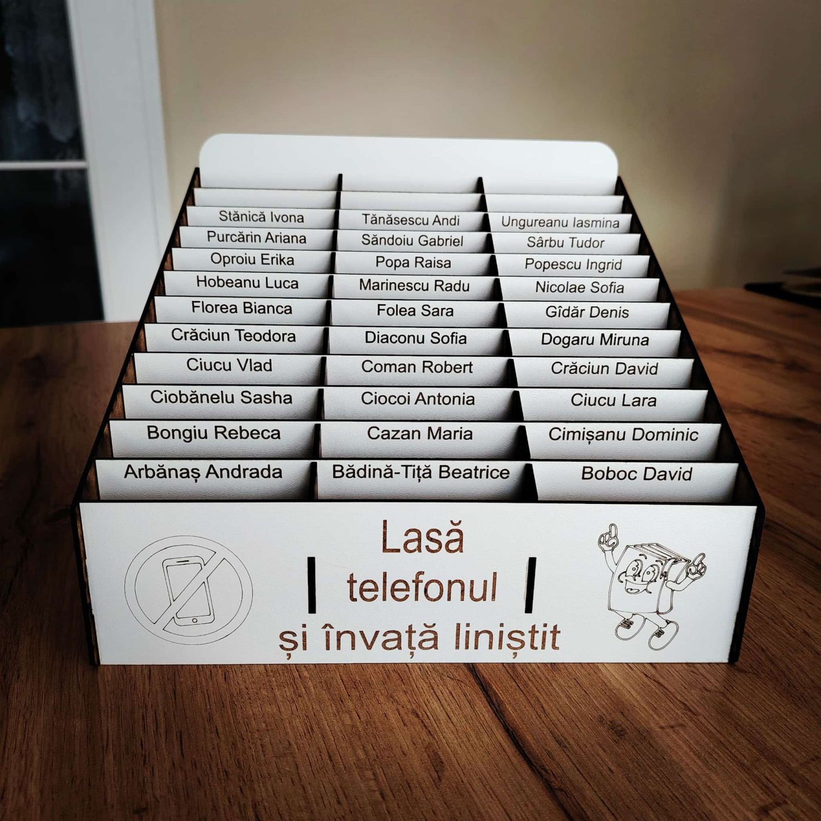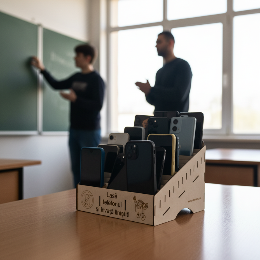 Cutia vine cu mesajl prestabilit "Lasă telefonul și învață liniștit" dar se poate personaliza si cu alt text (numele clasei, al profesorului, al scolii sau alt logo).