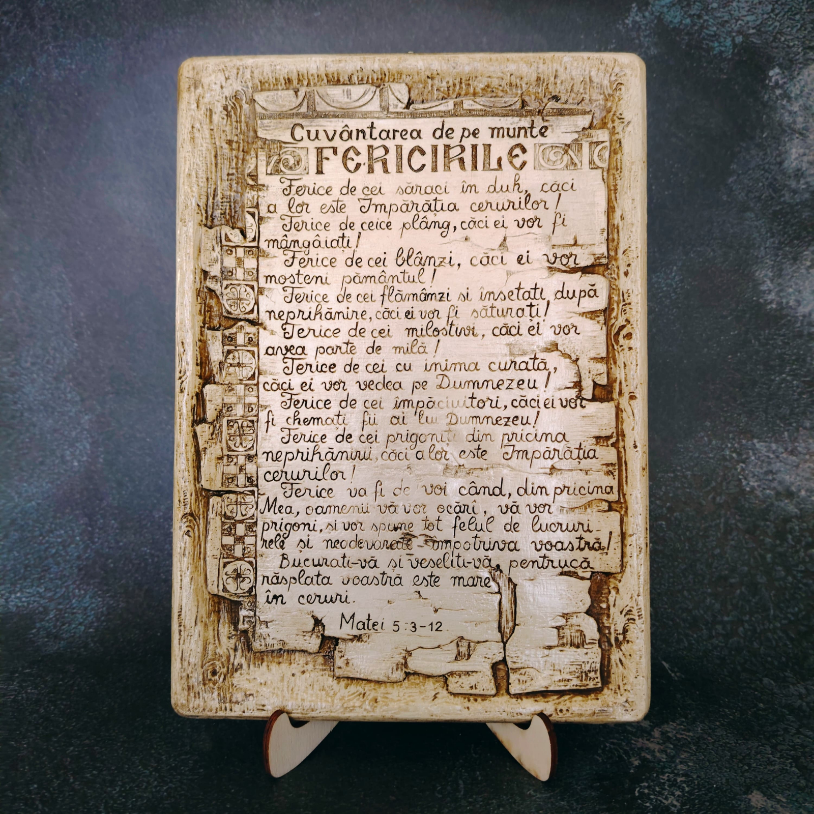Decorațiunea din ipsos „Fericirile” are un mesaj creștin puternic, inspirat din Evanghelia după Matei.