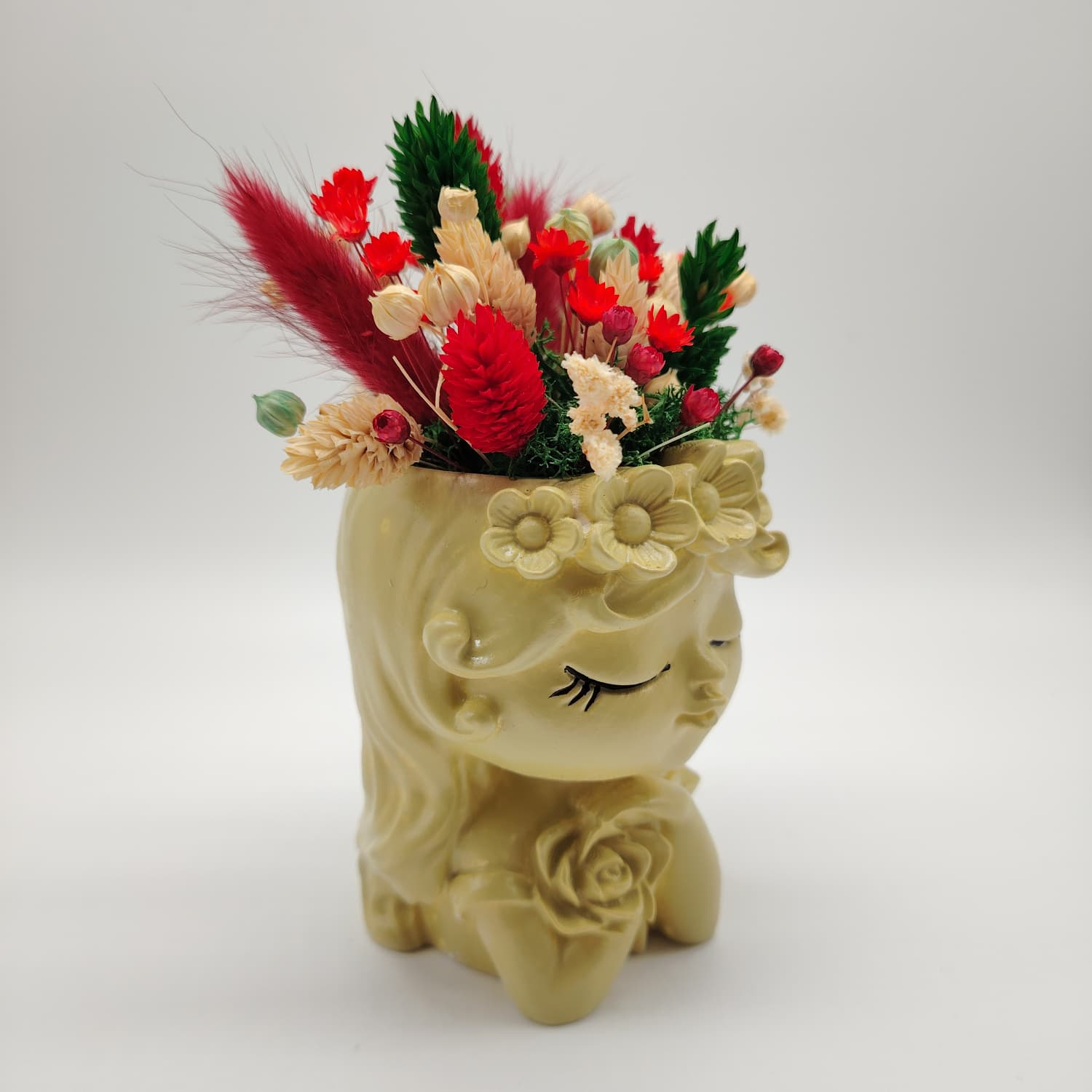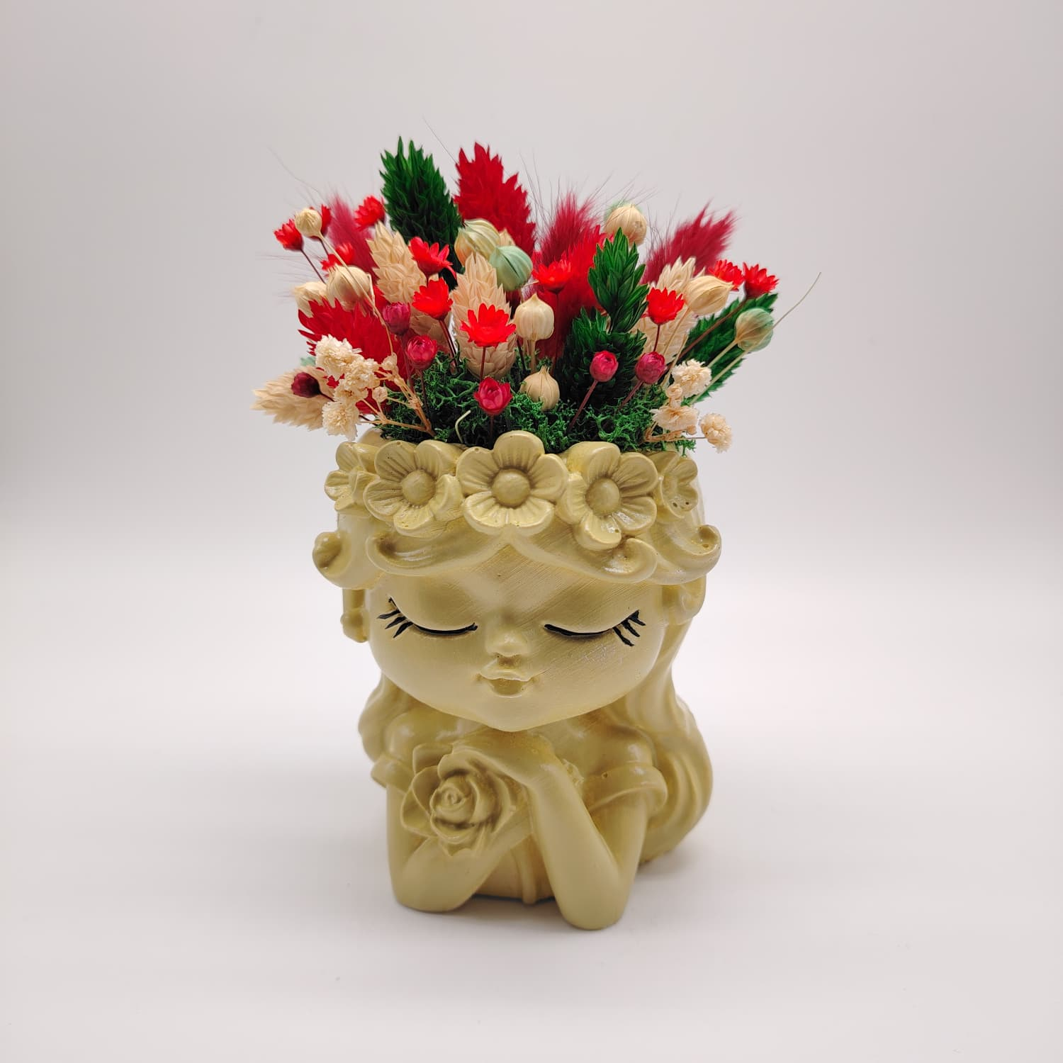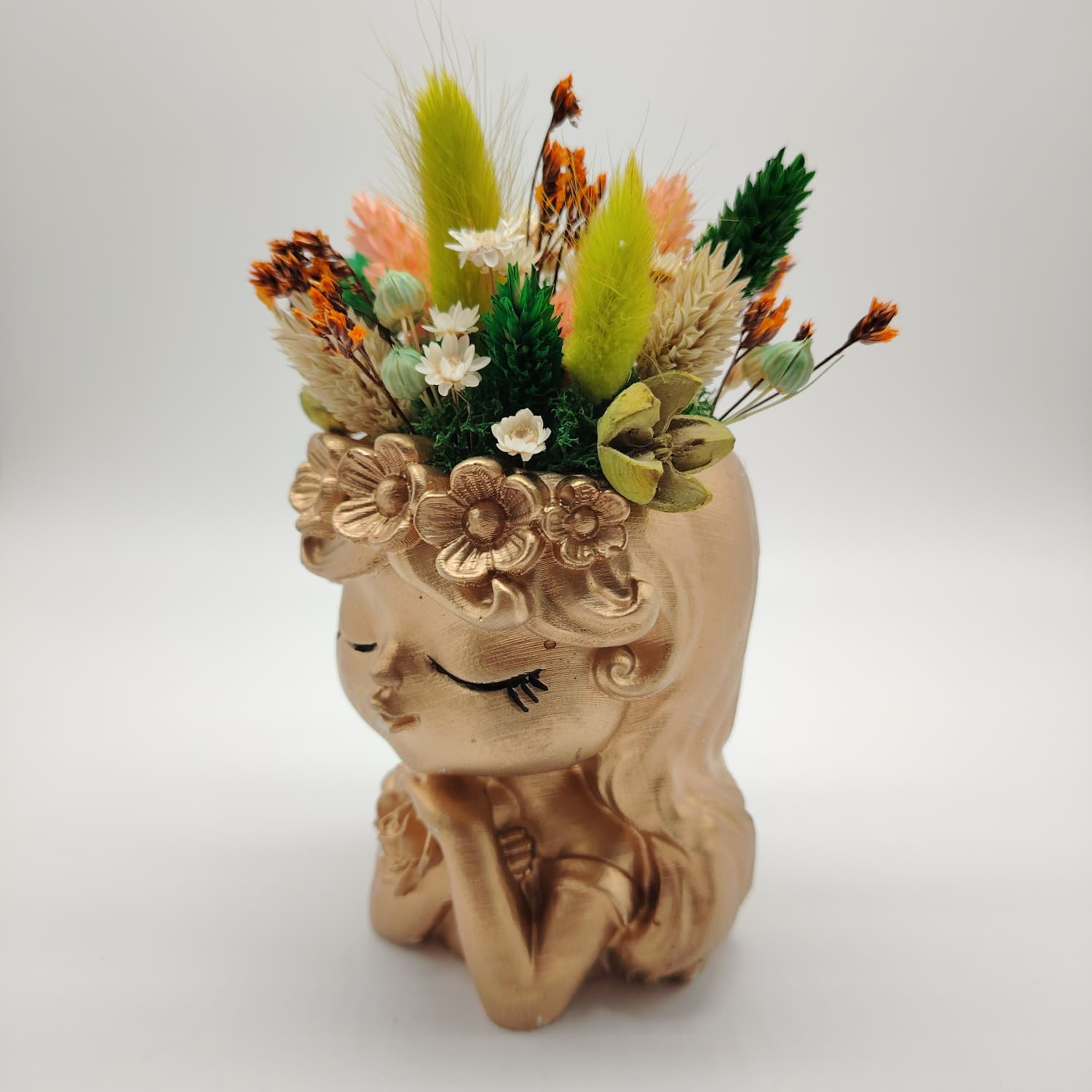 O vază decorativă din ipsos cu detalii fine, completată de un aranjament de flori uscate atent ales. Este un cadou gata de oferit.