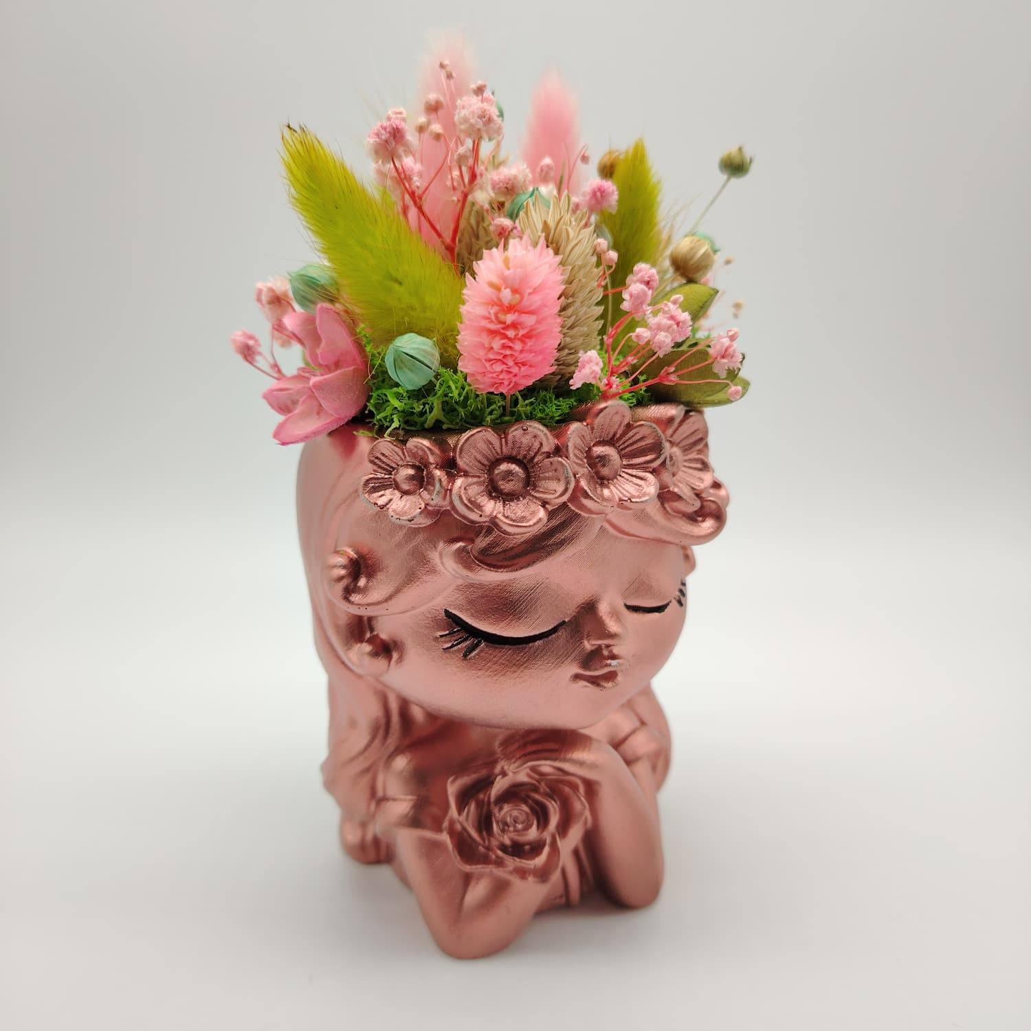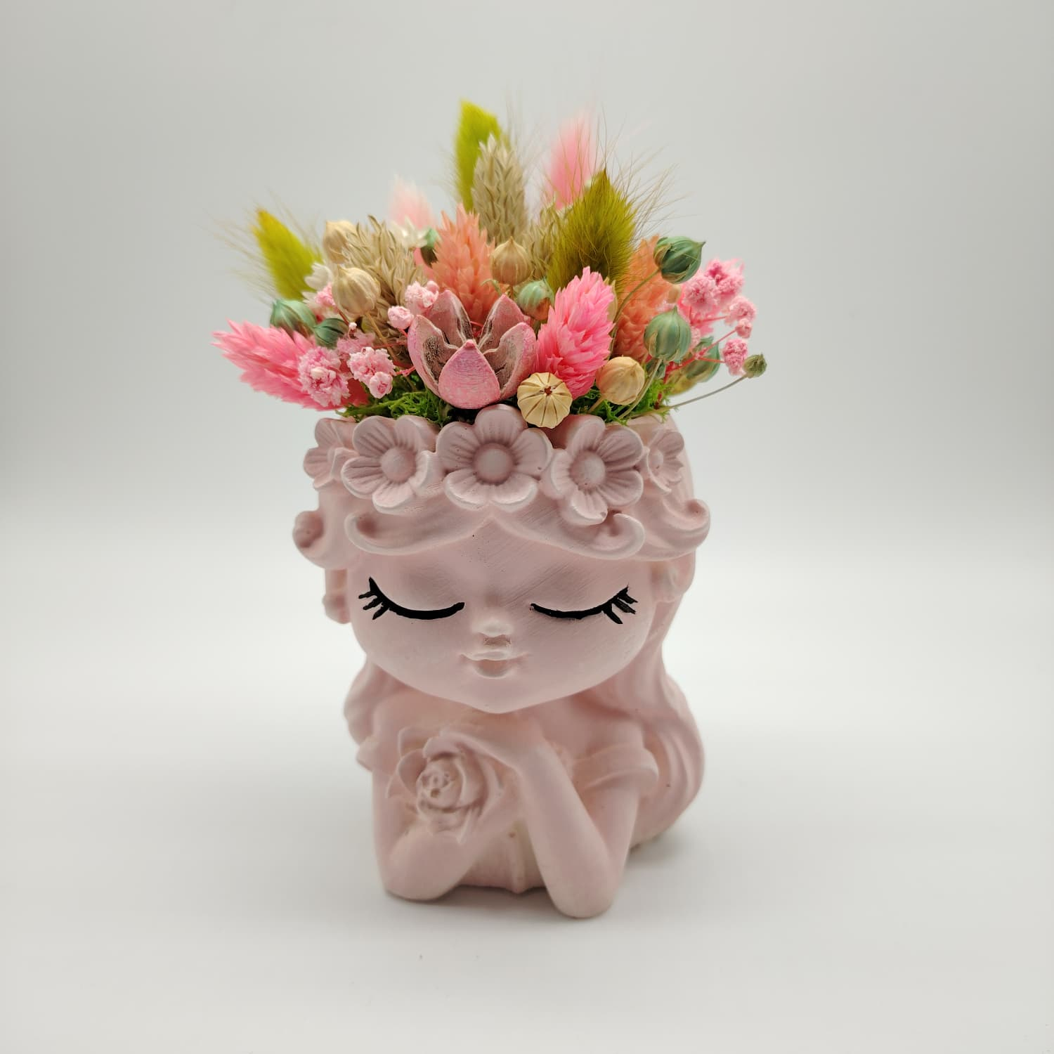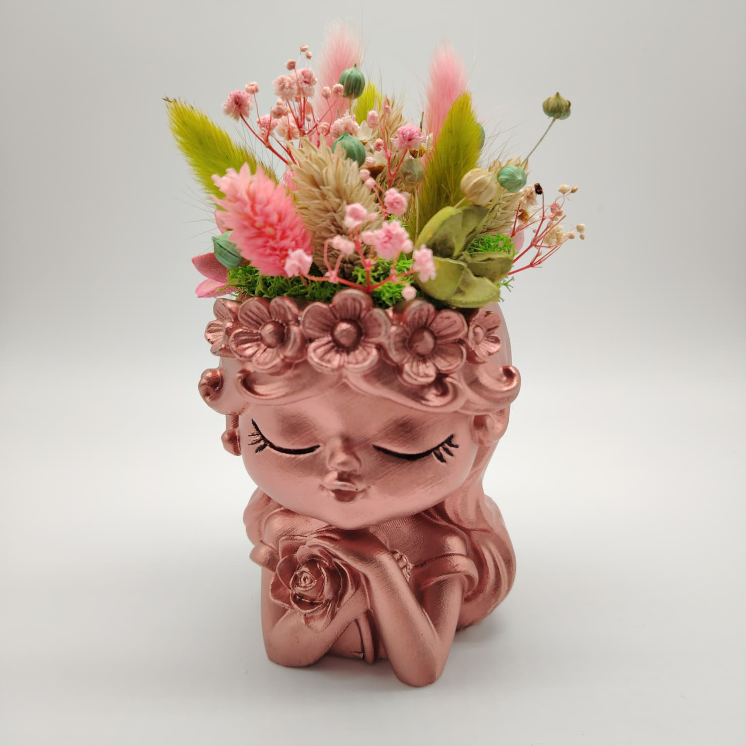 O vază decorativă din ipsos cu detalii fine, completată de un aranjament de flori uscate atent ales. Este un cadou gata de oferit.