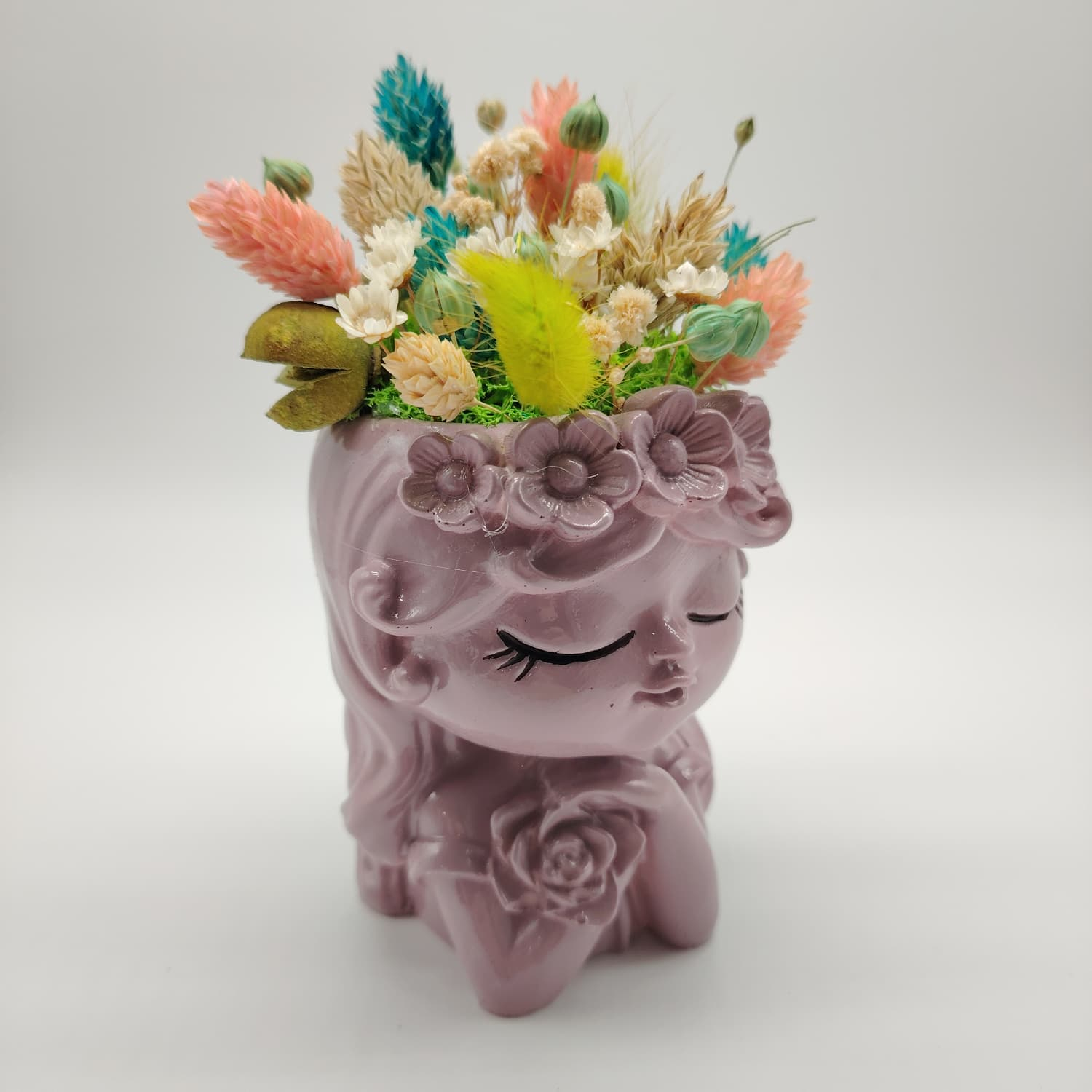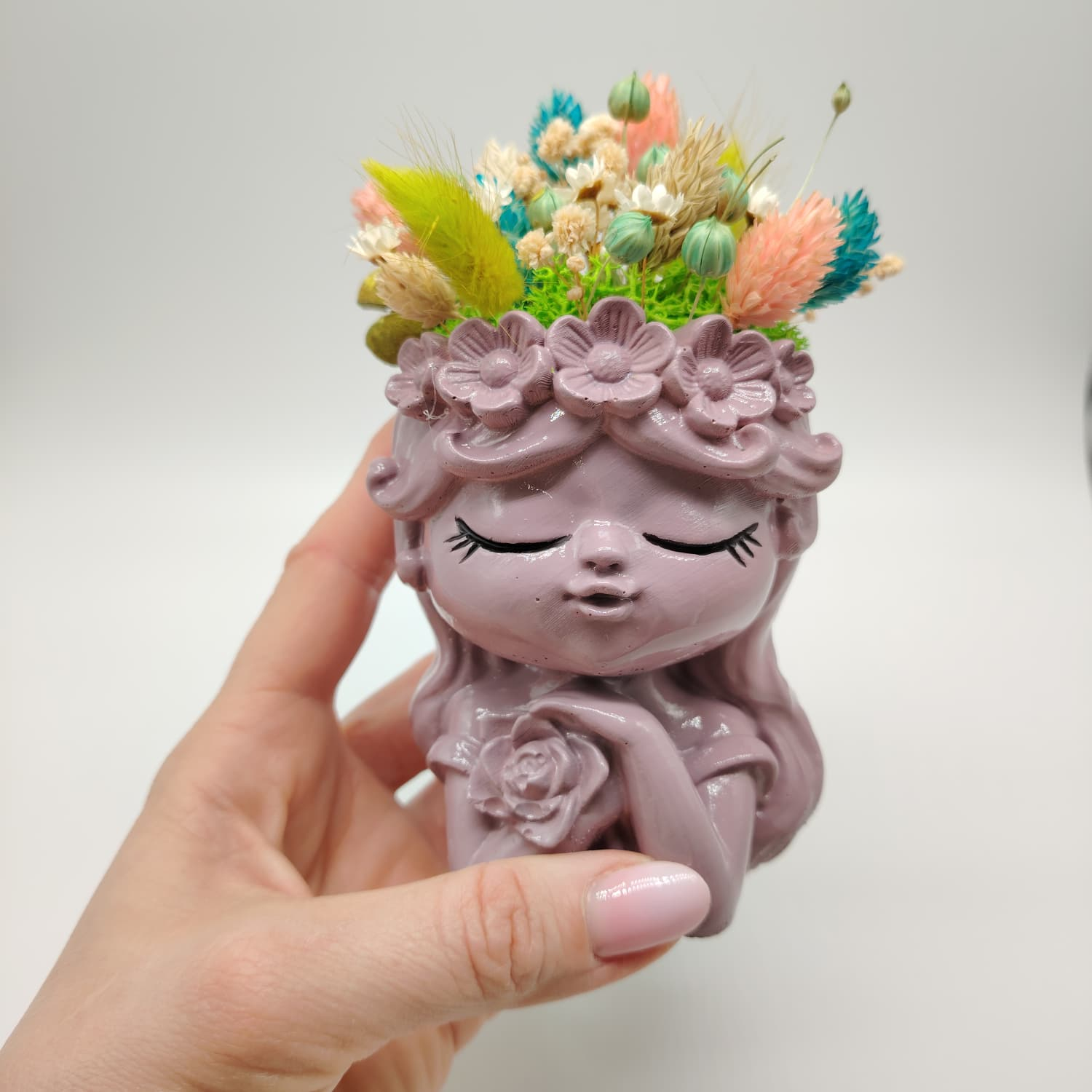 Are finisaje premium, suprafață netedă, proporții echilibrate și un aspect elegant. Florile uscate sunt armonios combinate, cu texturi și culori care atrag privirea fără să încarce vizual. Este ușoară, stabilă și potrivită pentru birou, comodă sau raft.