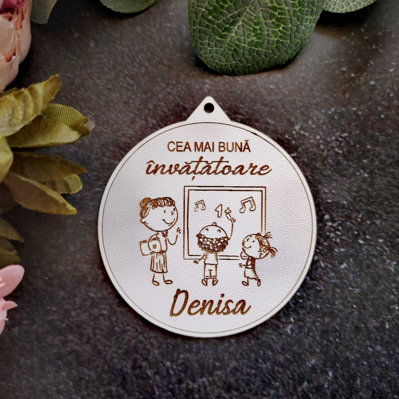 Medalia gravată pentru „Cea mai bună învățătoare” este realizată din MDF, cu un design jucăuș și mesaj personalizabil.