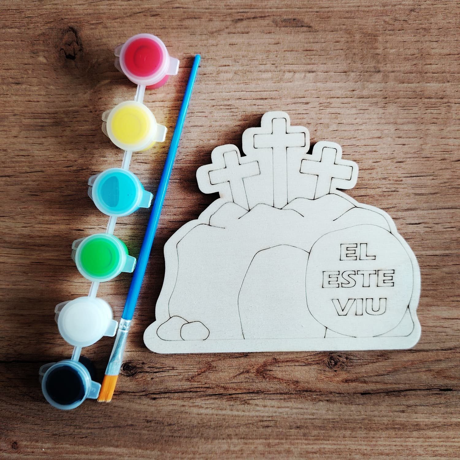 Plachetă din lemn „El este viu” (11 × 12,5 cm), concepută ca activitate creativă simplă pentru copii mai mici. Modelul reprezintă mormântul gol și cele trei cruci, iar suprafața gravată poate fi colorată ușor cu acuarele, carioci sau tempera.
