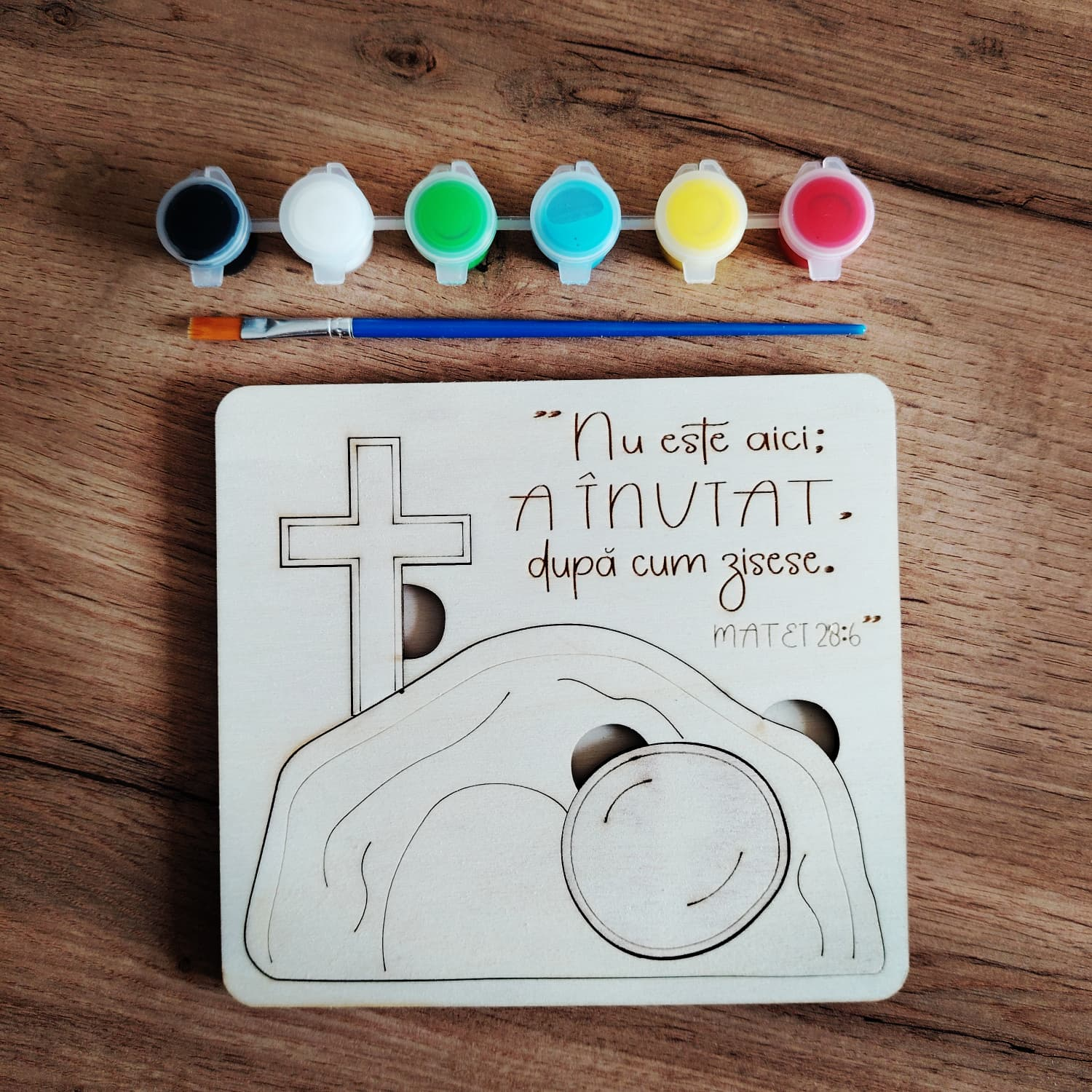 Puzzle din lemn „Isus a înviat” (15 × 16,5 cm), conceput ca activitate creativă pentru copii. Piesele se potrivesc în spațiile marcate și formează o scenă care ilustrează mesajul central al Paștelui.