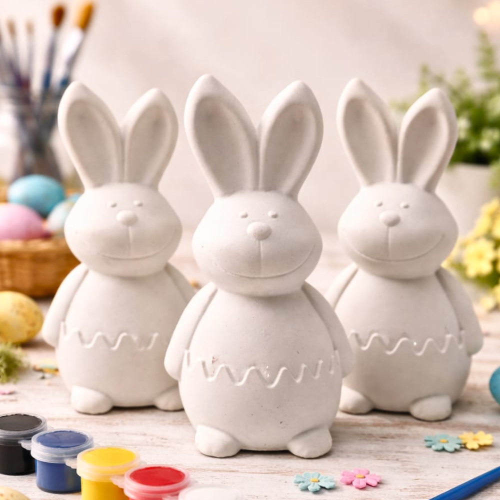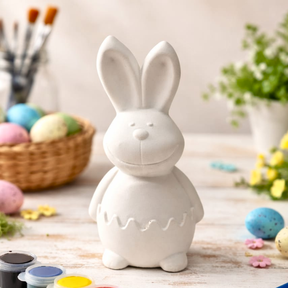 Figurina este realizată din ipsos super alb, cu finisaj curat și detalii bine conturate. Suprafața este netedă, iar liniile decorative sunt suficient de adânci pentru a ghida pictarea. Culorile aderă bine și scot în evidență forma jucăușă a iepurașului.