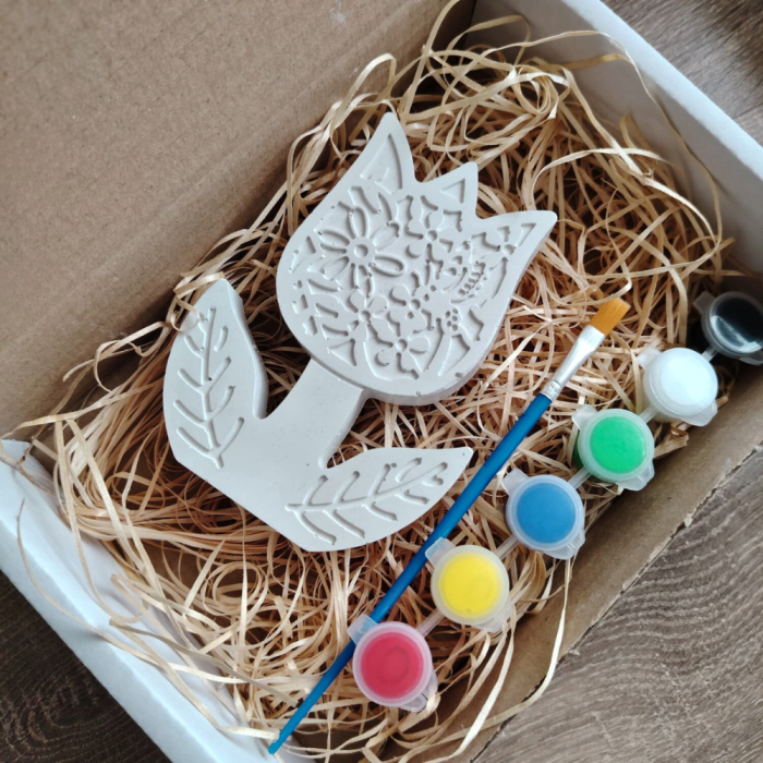Set creativ din ipsos „Lalea” – o figurină delicată, cu forme clare și detalii florale fine, gândită special pentru pictat. Vine însoțită de set de culori și pensulă, astfel încât activitatea poate începe imediat.