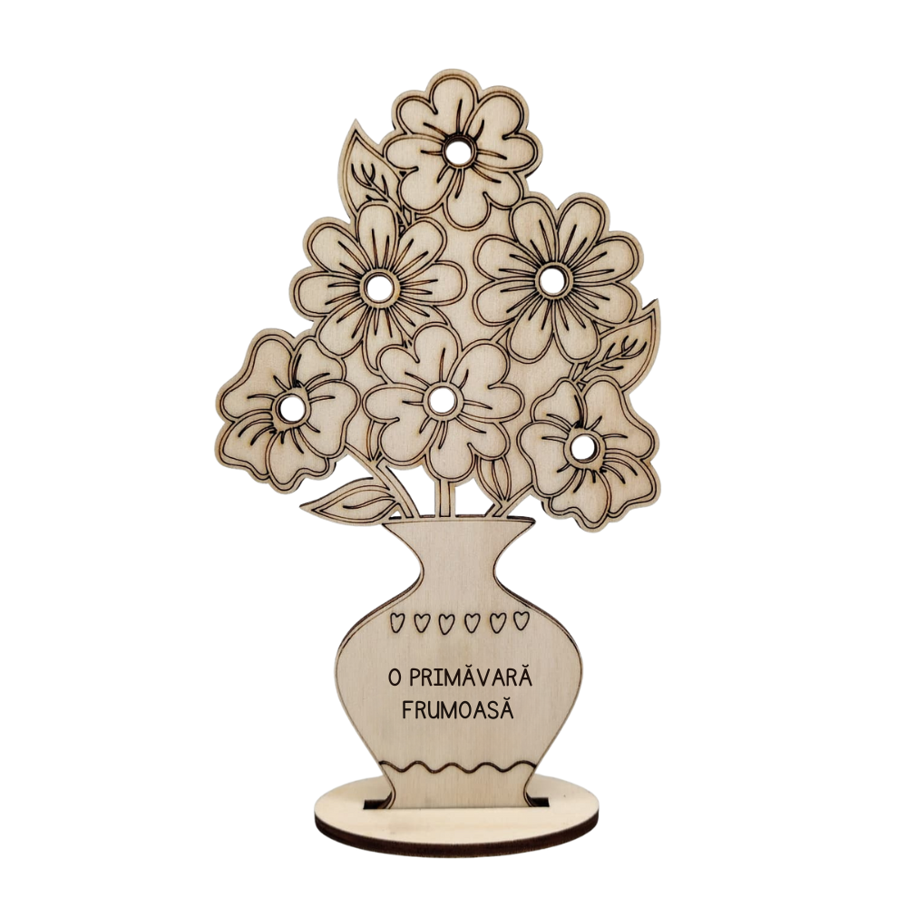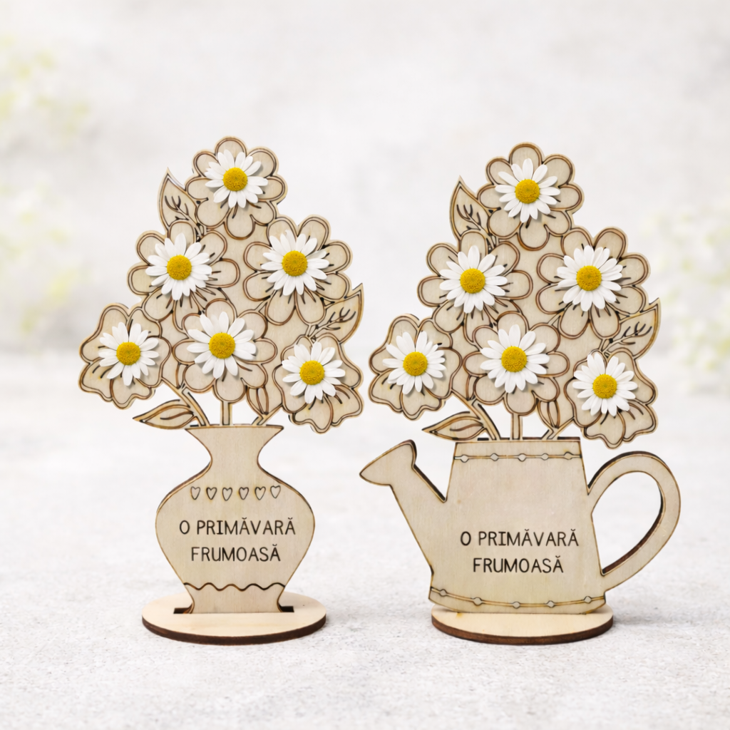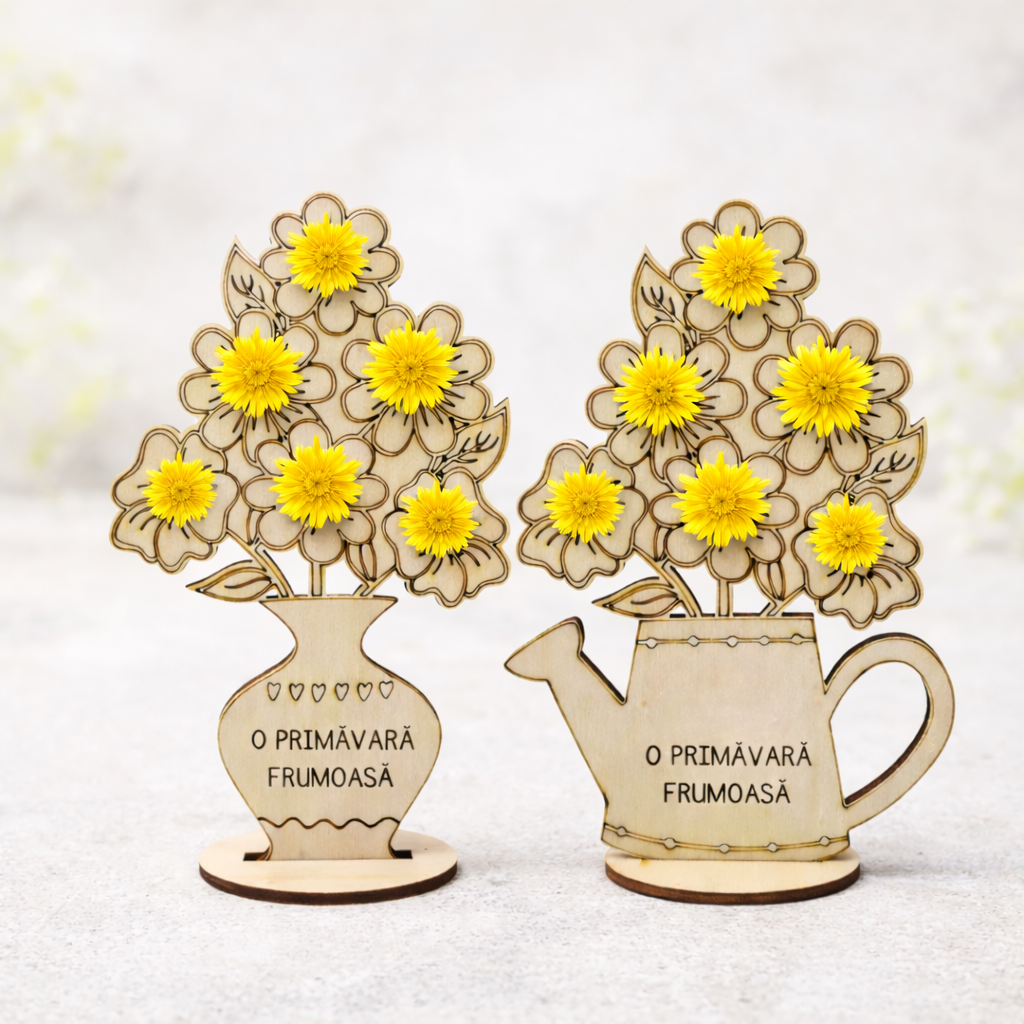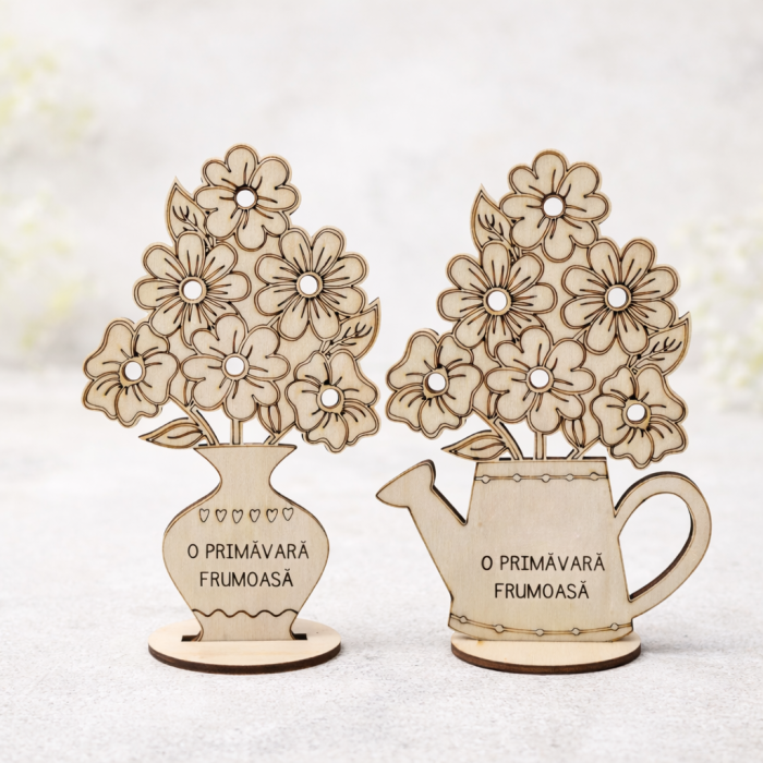 Este o decorațiune din lemn, în formă de stropitoare sau vază, cu flori decupate fin și mesaj simplu: „O primăvară frumoasă”. Are 17 × 12 cm, dimensiune potrivită pentru un pervaz sau un raft. Lemnul este lăsat natural, cu linii clare și detalii desenate prin gravare, fără încărcare inutilă.