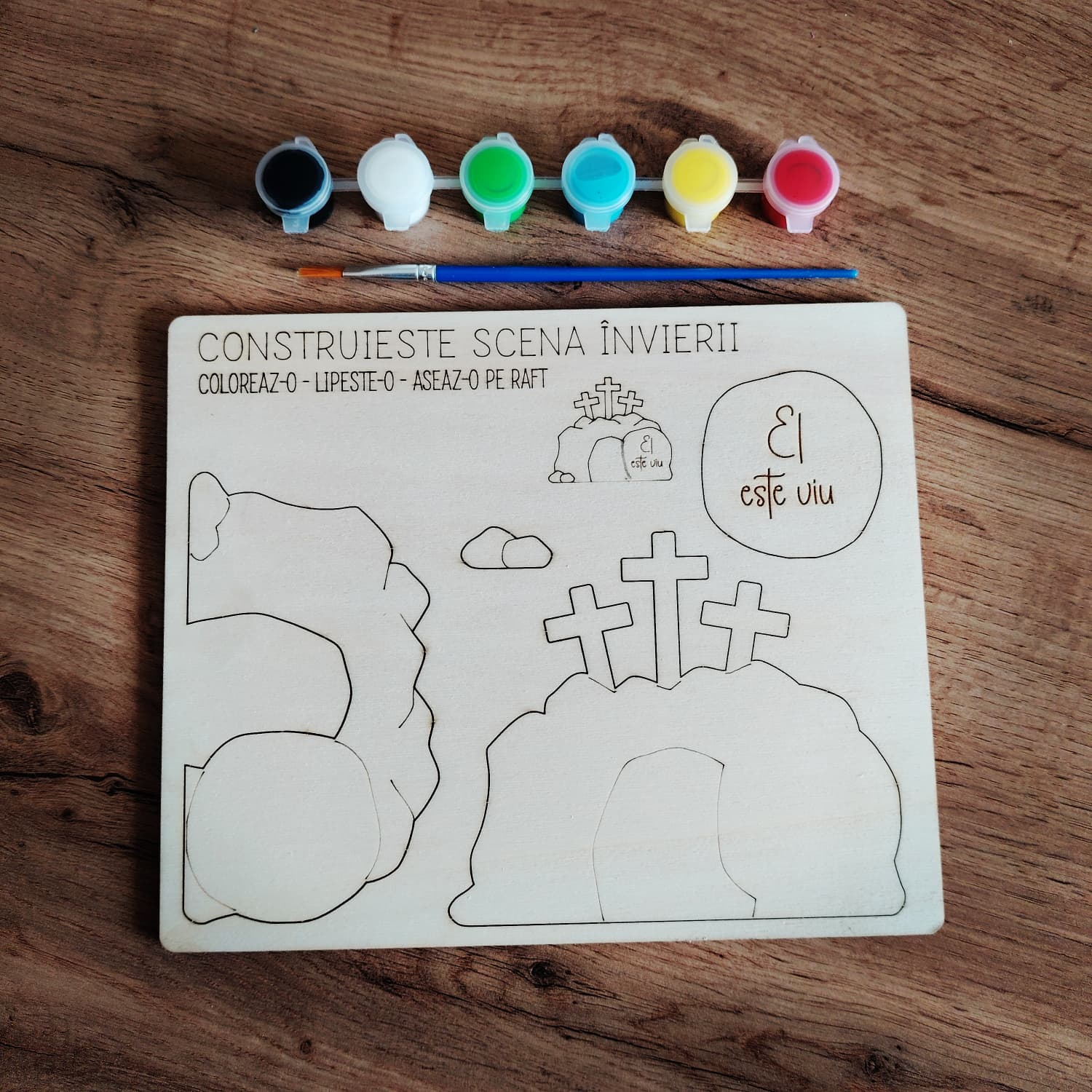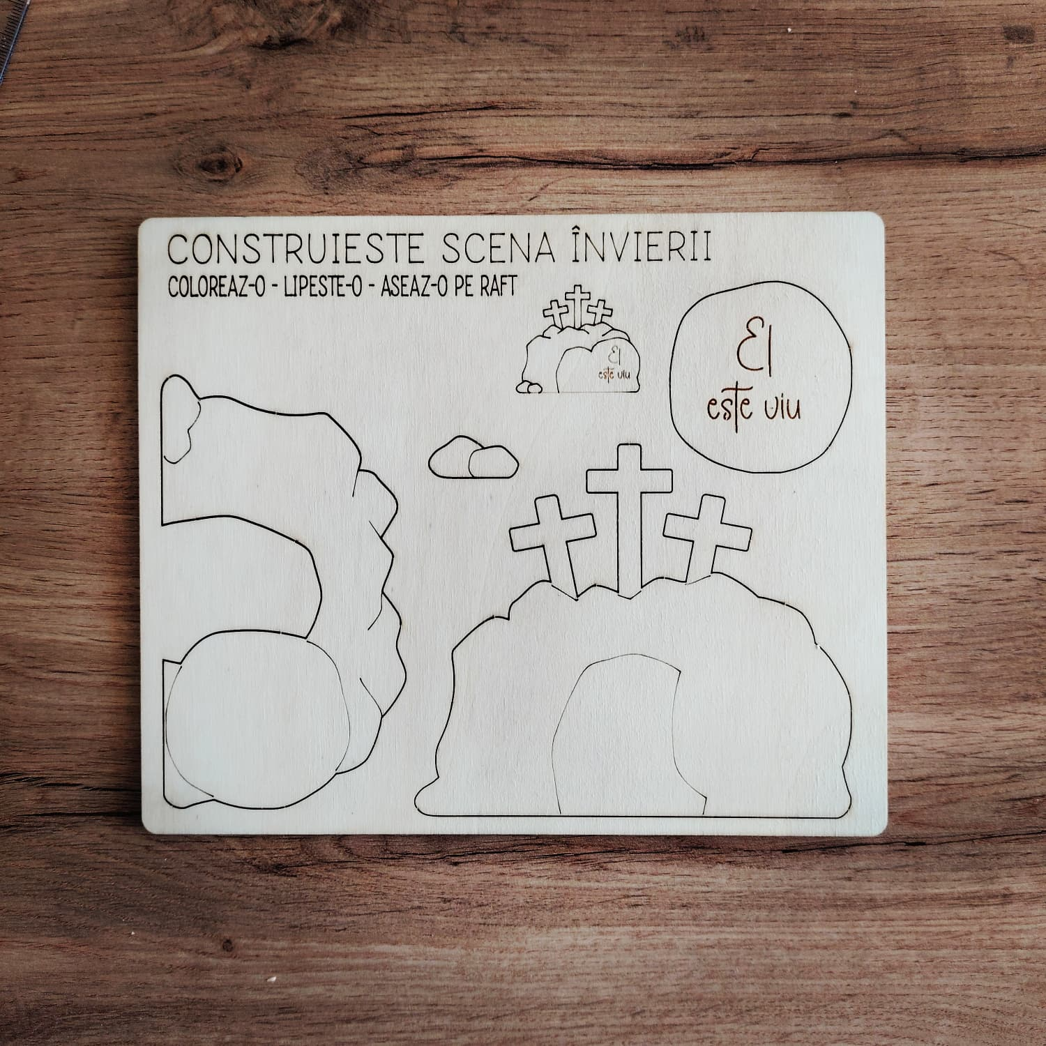 Plachetă din lemn „Scena Învierii” (21,8 × 18 cm), concepută ca activitate creativă pentru copii. Piesele sunt decupate în placă și pot fi desprinse, colorate și apoi lipite pentru a crea o mică scenă decorativă care ilustrează momentul Învierii.