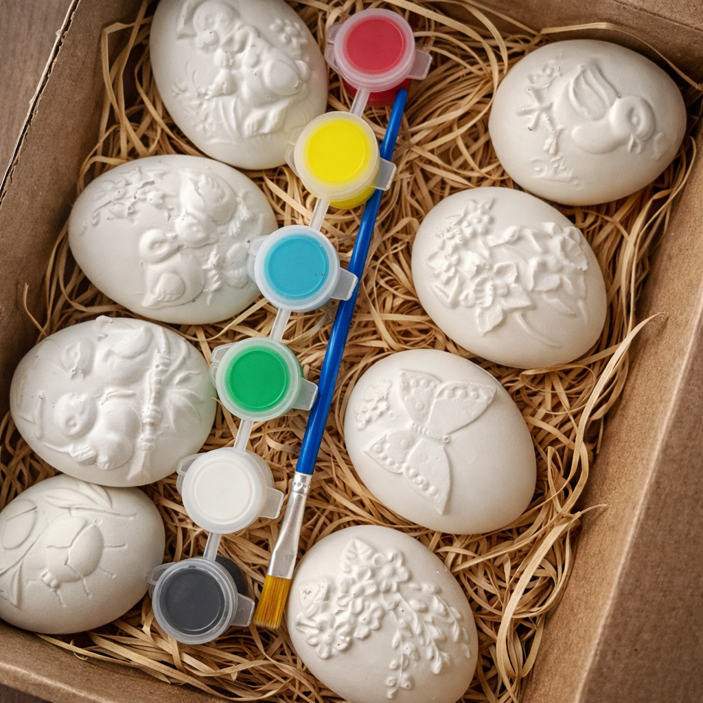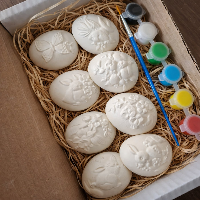 Set creativ cu tematică de Paște ce conține 8 figurine din ipsos în formă de ou, fiecare cu model diferit: pui, flori, fluture sau elemente de primăvară. Figurinele sunt așezate într-o cutie împreună cu un set de 6 culori și o pensulă, astfel încât activitatea poate începe imediat. Dimensiunea fiecărui ou este apropiată de cea a unui ou natural mai mic, fiind ușor de ținut și de pictat.