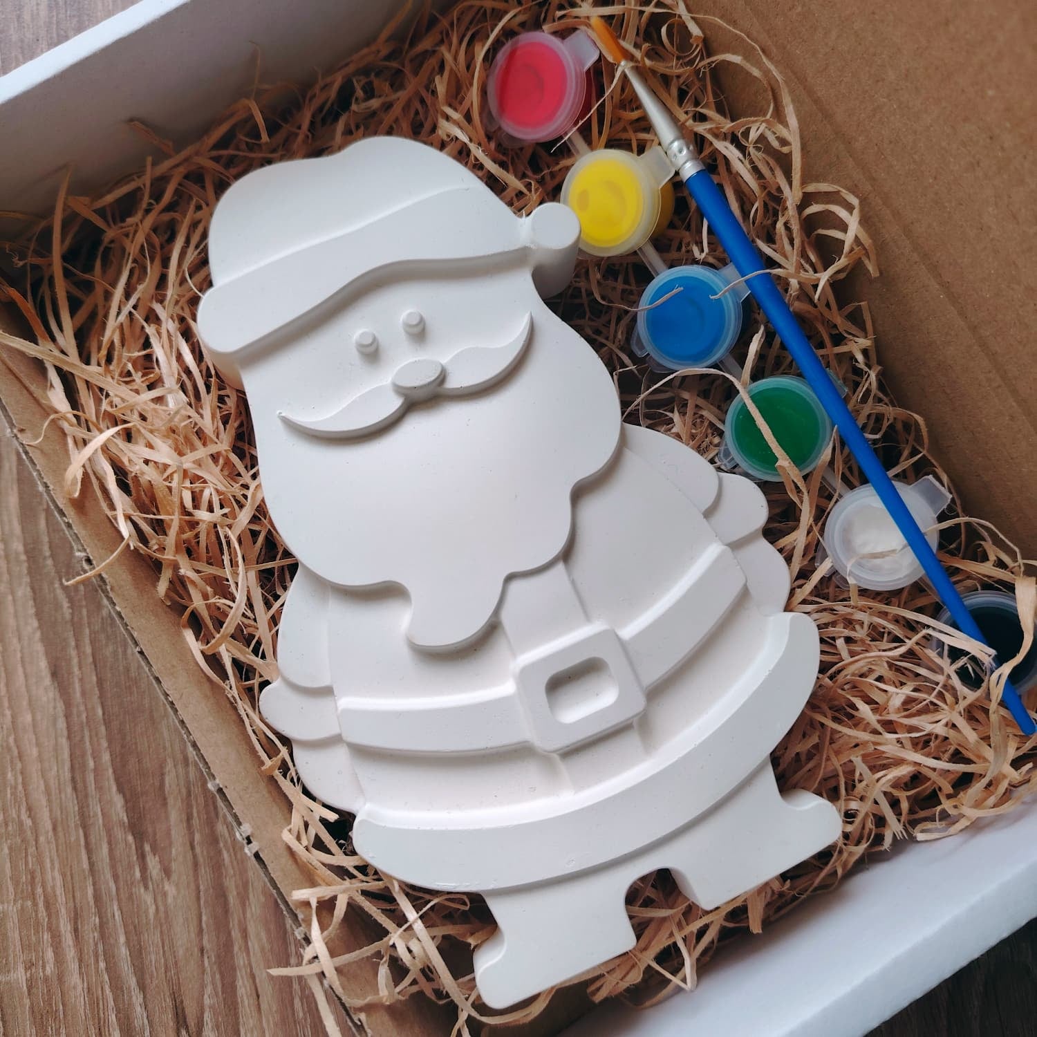 Moș Crăciun din ipsos, 15x12 cm, cu forme clare și suprafață netedă. Vine într-o cutie care arată bine imediat ce o deschizi: culori acrilice, pensulă și prezentare curată. Este exact genul de cadou rapid pe care îl pui în punga lui Moș Crăciun și arată ca și cum l-ai pregătit din timp.